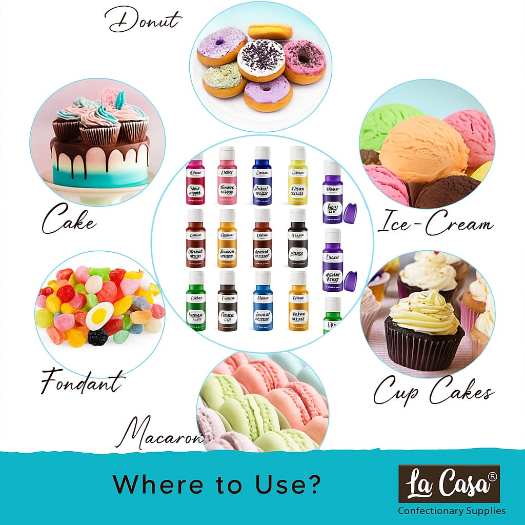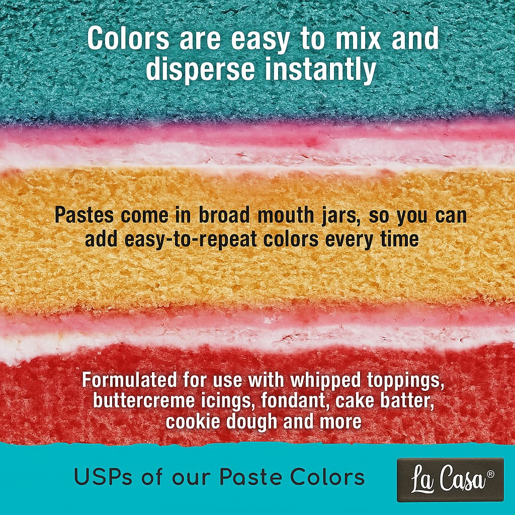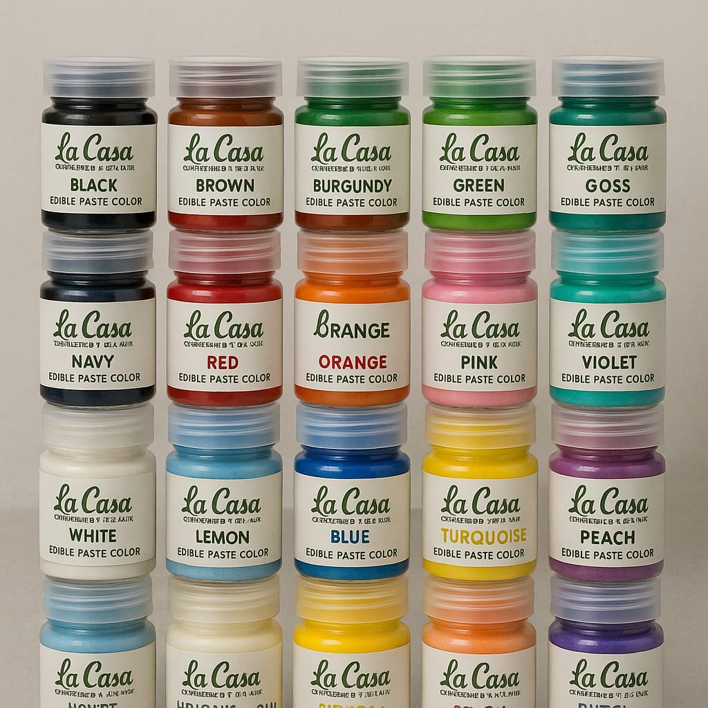 La Casa® Edible Paste Colors are specially crafted for bakers who want deep, consistent, and professional-grade coloring in their creations. Our paste formula is more concentrated than liquid colors, allowing you to achieve bold shades using very little product. Designed to mix effortlessly into buttercream, fondant, cake batter, ice-cream mixes, gummies, chocolate, and more—these paste colors offer endless creativity in the kitchen.
