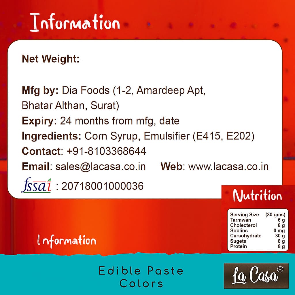 Packaged in a broad-mouth jar, La Casa paste colors are easy to scoop, control, and repeat. Whether you’re decorating cakes, making colorful macarons, or preparing festive desserts, these colors help you achieve picture-perfect results. Made with safe, high-quality ingredients and certified by FSSAI, they are suitable for all food applications.